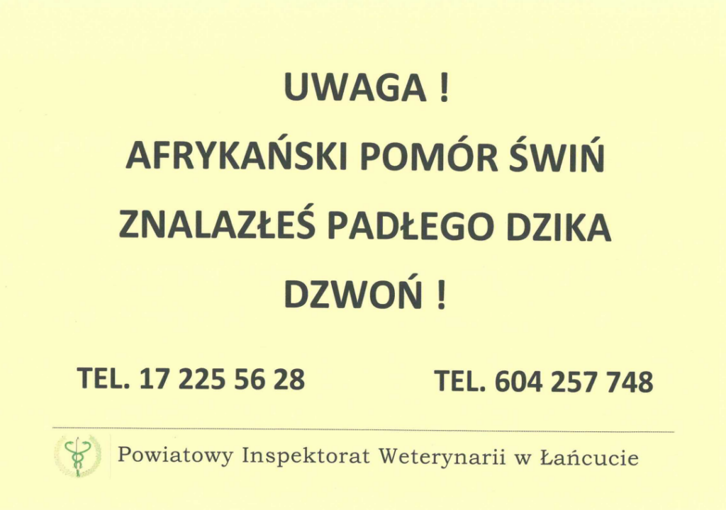 Aktualności UWAGA! Afrykański Pomór Świń Opublikowano 20 stycznia 2026 admin Znalazłeś padłego dzika – dzwoń! TEL: 17 225 56 28 TEL: 604 257 748